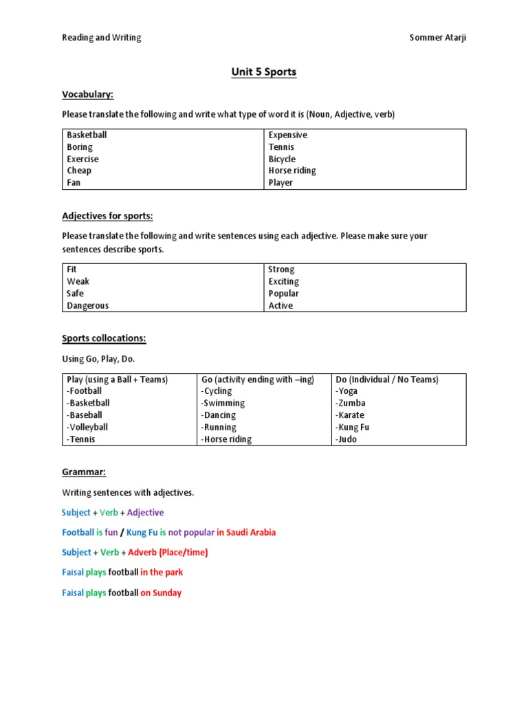 Unit 5 Sports Vocabulary Noun Adjective